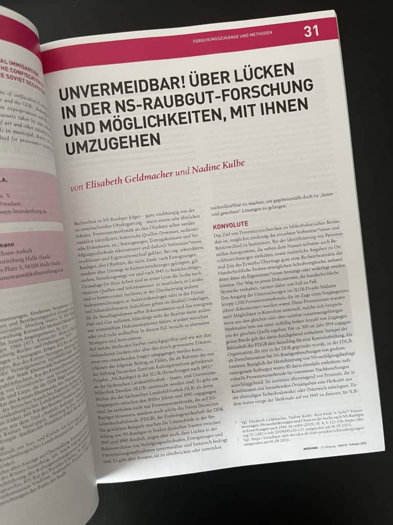 - Elisabeth Geldmacher/Nadine Kulbe: unvermeidbar! Über Lücken in der NS-Raubgut-Forschung und Möglichkeiten, mit ihnen umzugehen